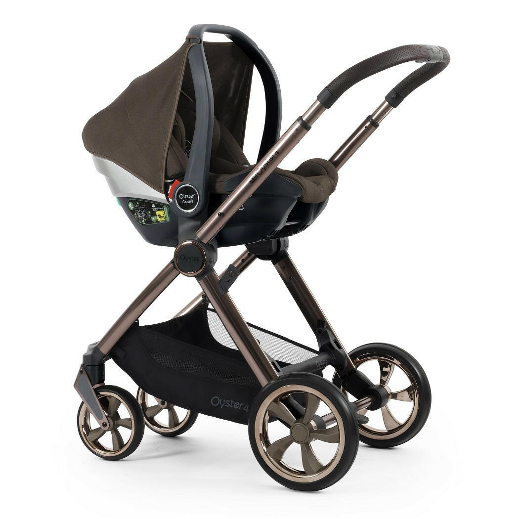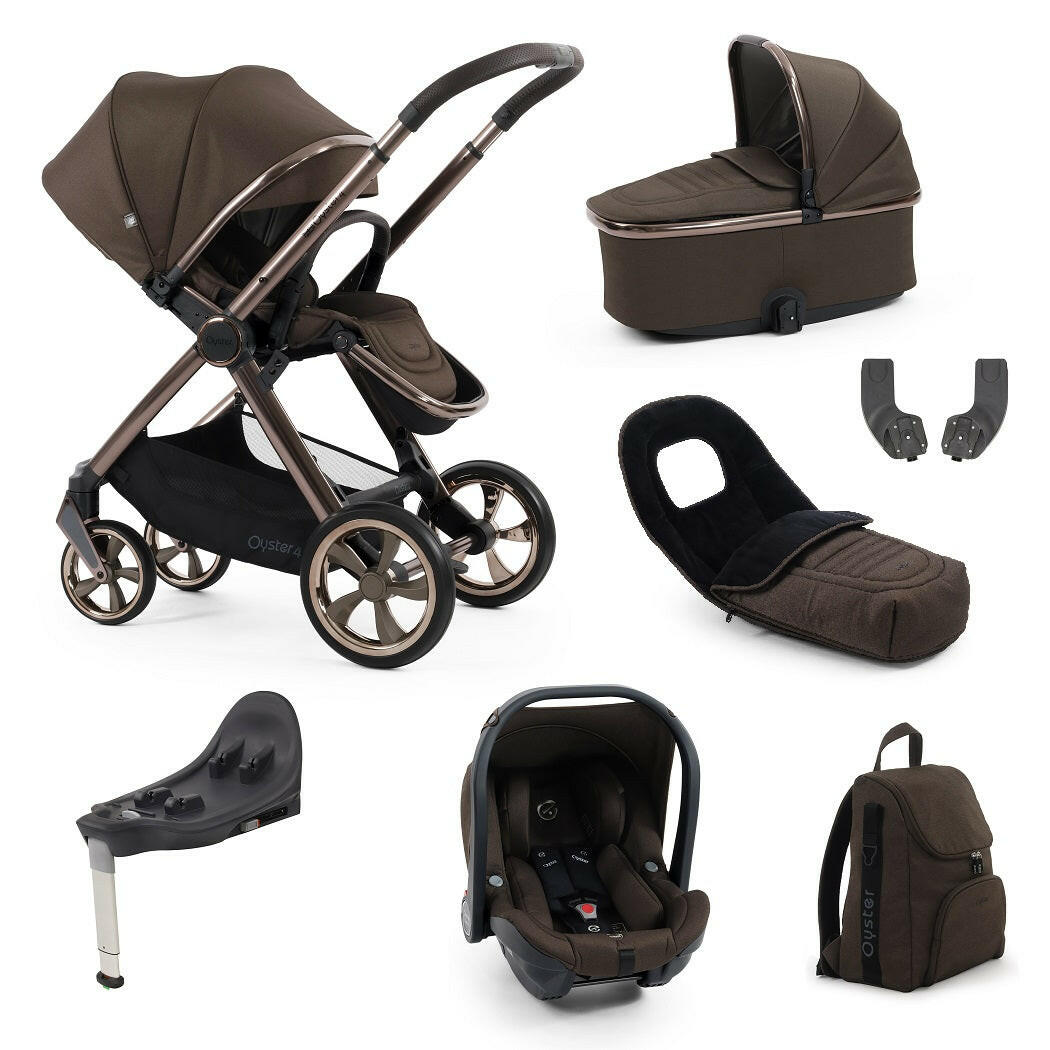 Oyster4 Brown Chassis (Chocolate Velvet) Ultimate Bundle includes a matching pushchair, carrycot, changing backpack, footmuff, bottle holder, buggy lock, parasol and reversible fur liner with Capsule Infant Car Seat, rain cover, multi adaptors and DuoFix ISOFIX Base.