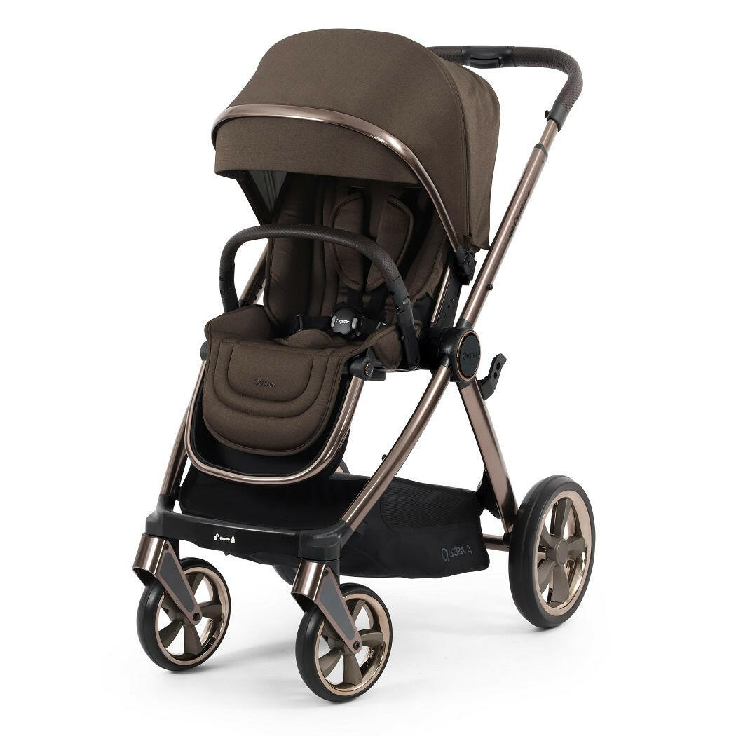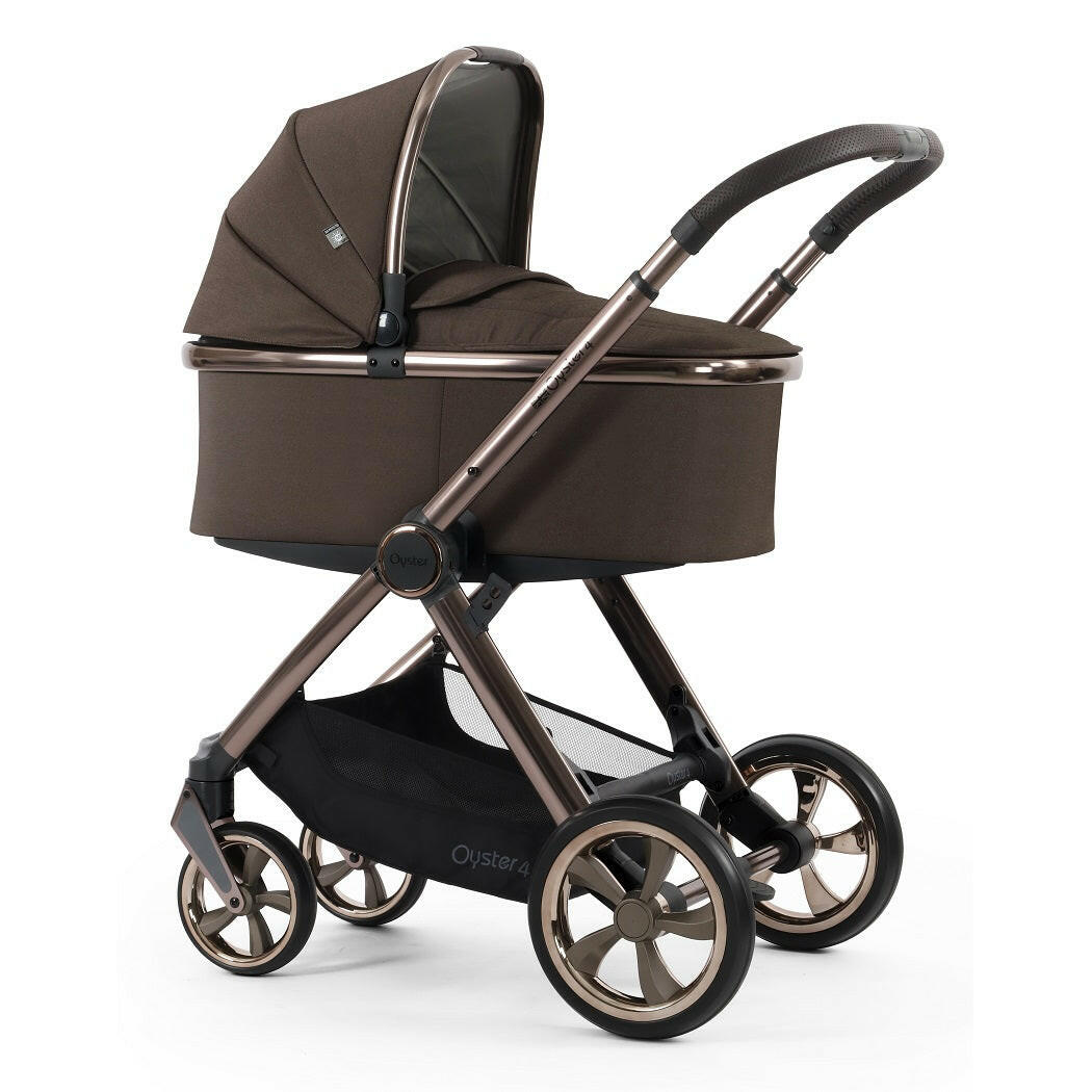Oyster4 Brown Chassis (Chocolate Velvet) Ultimate Bundle includes a matching pushchair, carrycot, changing backpack, footmuff, bottle holder, buggy lock, parasol, rain cover, reversible fur liner and multi adaptors with a Cybex Cloud T i-Size Infant Car Seat and Base T ISOFIX Base.