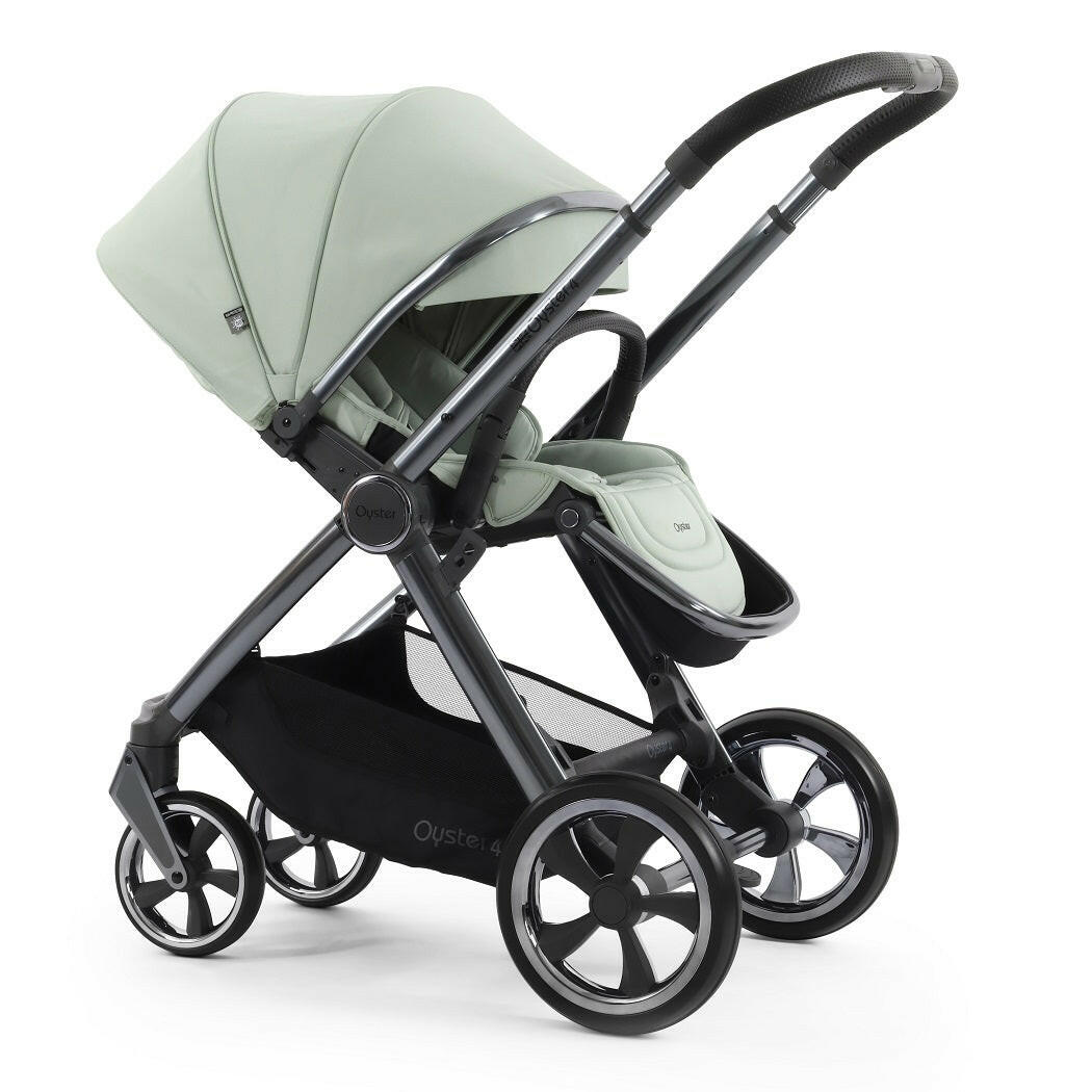 Oyster4 Gunmetal Chassis (Pistachio) Ultimate Bundle includes a matching pushchair, carrycot, changing backpack, footmuff, bottle holder, buggy lock, parasol, rain cover, reversible fur liner and multi adaptors with a Cybex Cloud T i-Size Infant Car Seat and Base T ISOFIX Base.