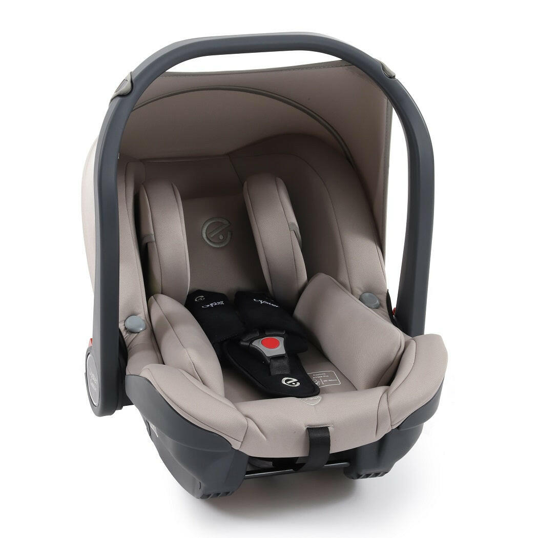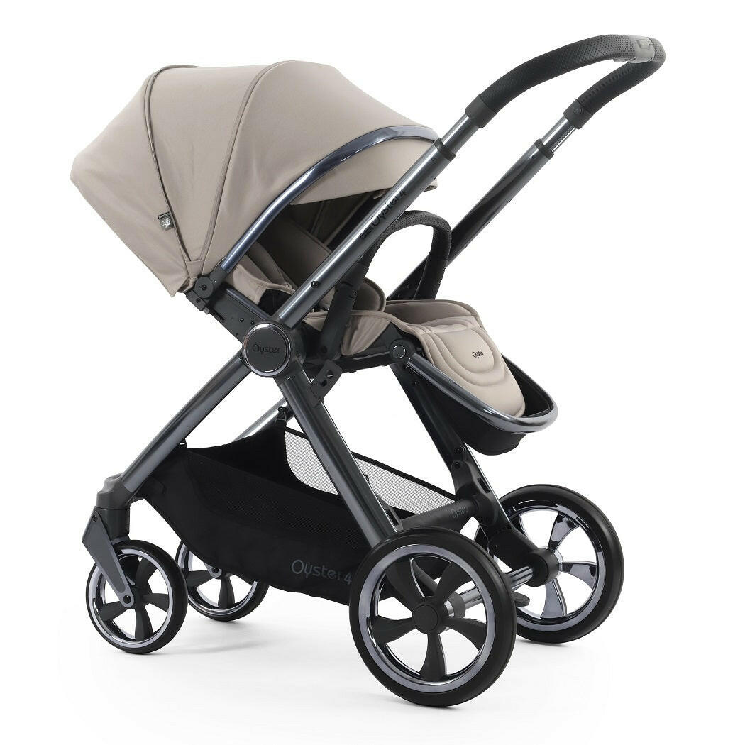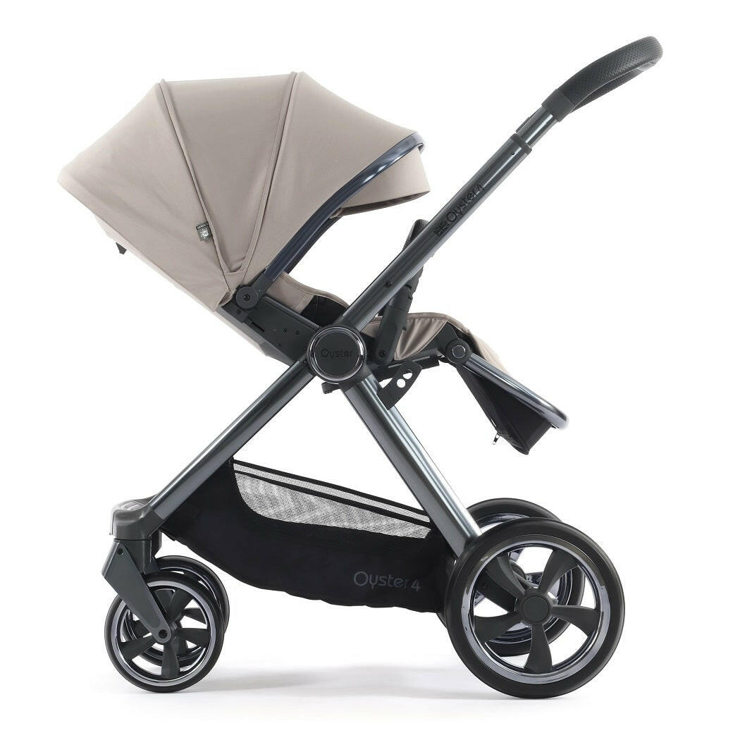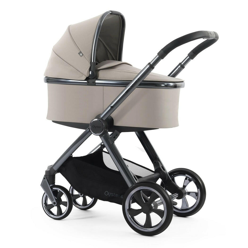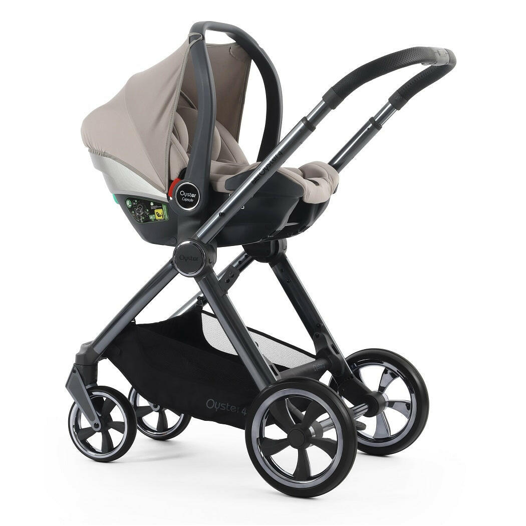 Oyster4 Gunmetal Chassis (Stone) Ultimate Bundle includes a matching pushchair, carrycot, changing backpack, footmuff, bottle holder, buggy lock, parasol and reversible fur liner with Capsule Infant Car Seat, rain cover, multi adaptors and DuoFix ISOFIX Base.