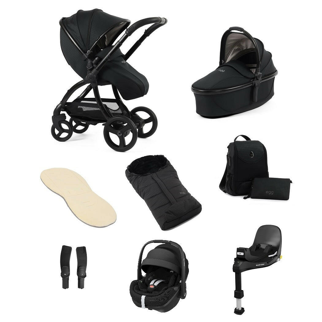 egg3® Houndstooth Black (Special Edition) - Luxury Bundle with Maxi-Cosi comprises of a carrycot, reversible seat unit, chassis and accessories with Maxi-Cosi`s Pebble 360 Pro² Infant Car Seat and FamilyFix 360 Pro ISOFIX Base.