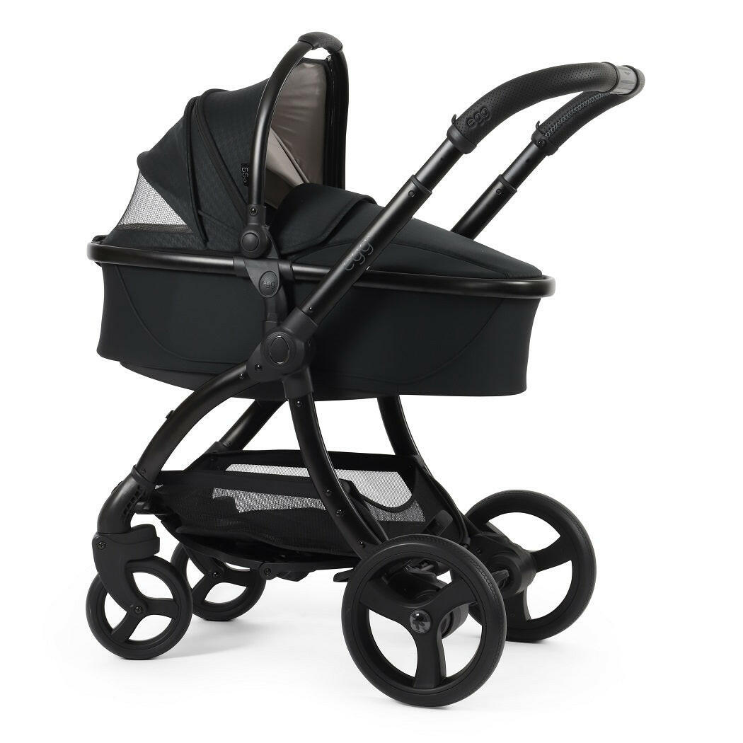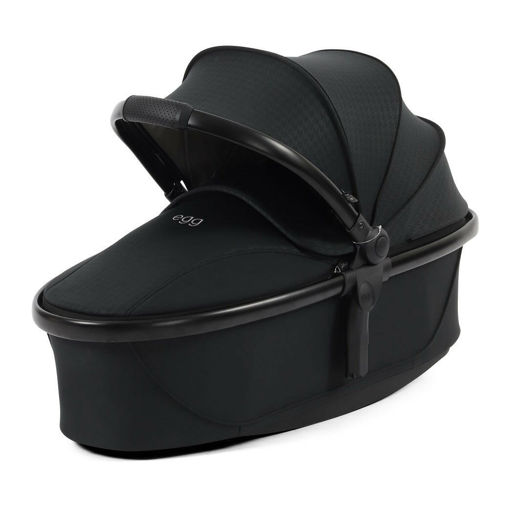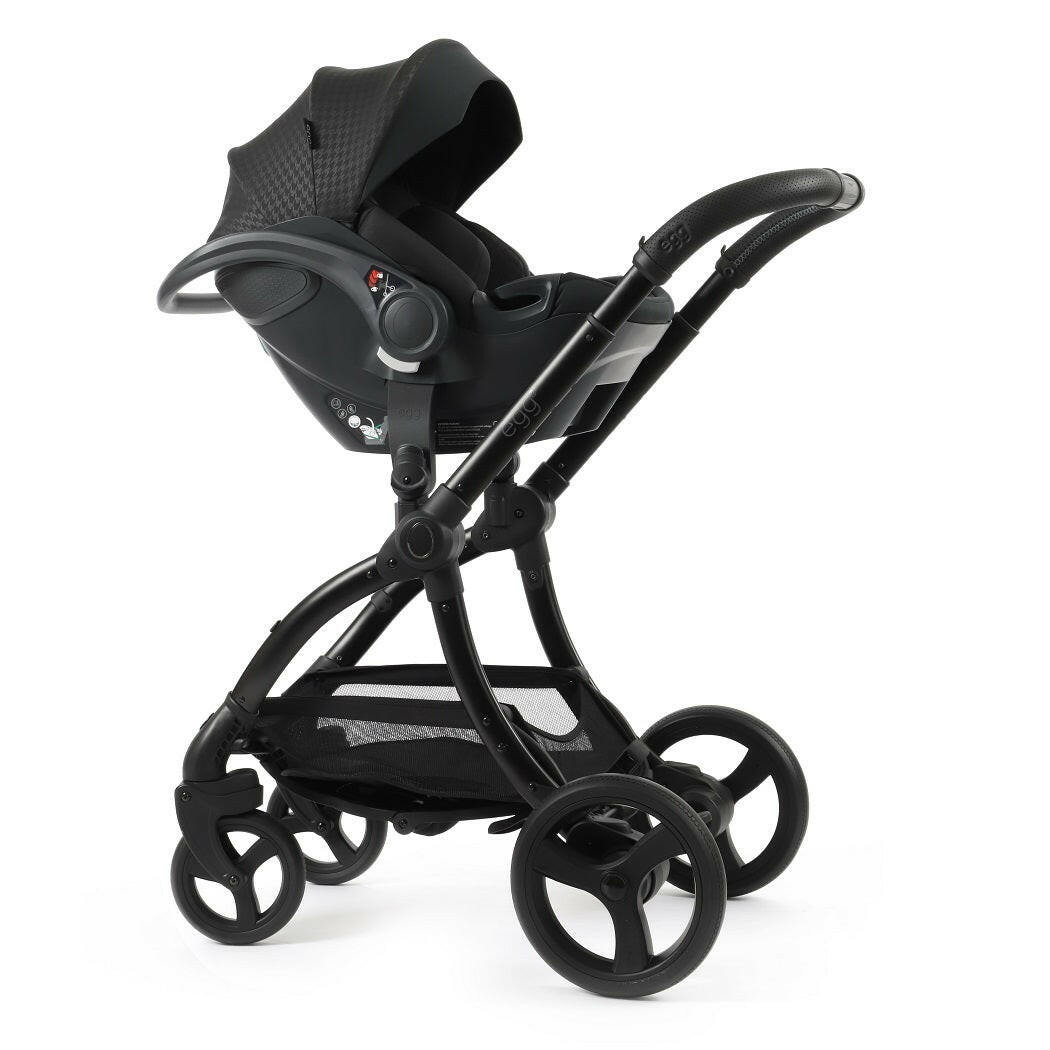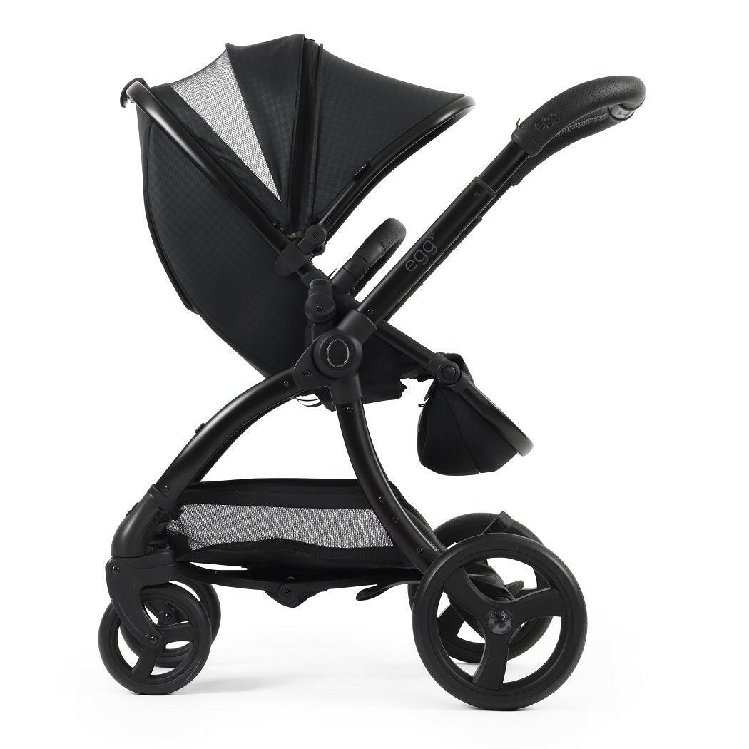 egg3® Luxury Bundle (Houndstooth Black - Special Edition) comprises of a carrycot, reversible seat unit, chassis and accessories with a matching egg3 Shell i-size car seat and ISOFIX base.