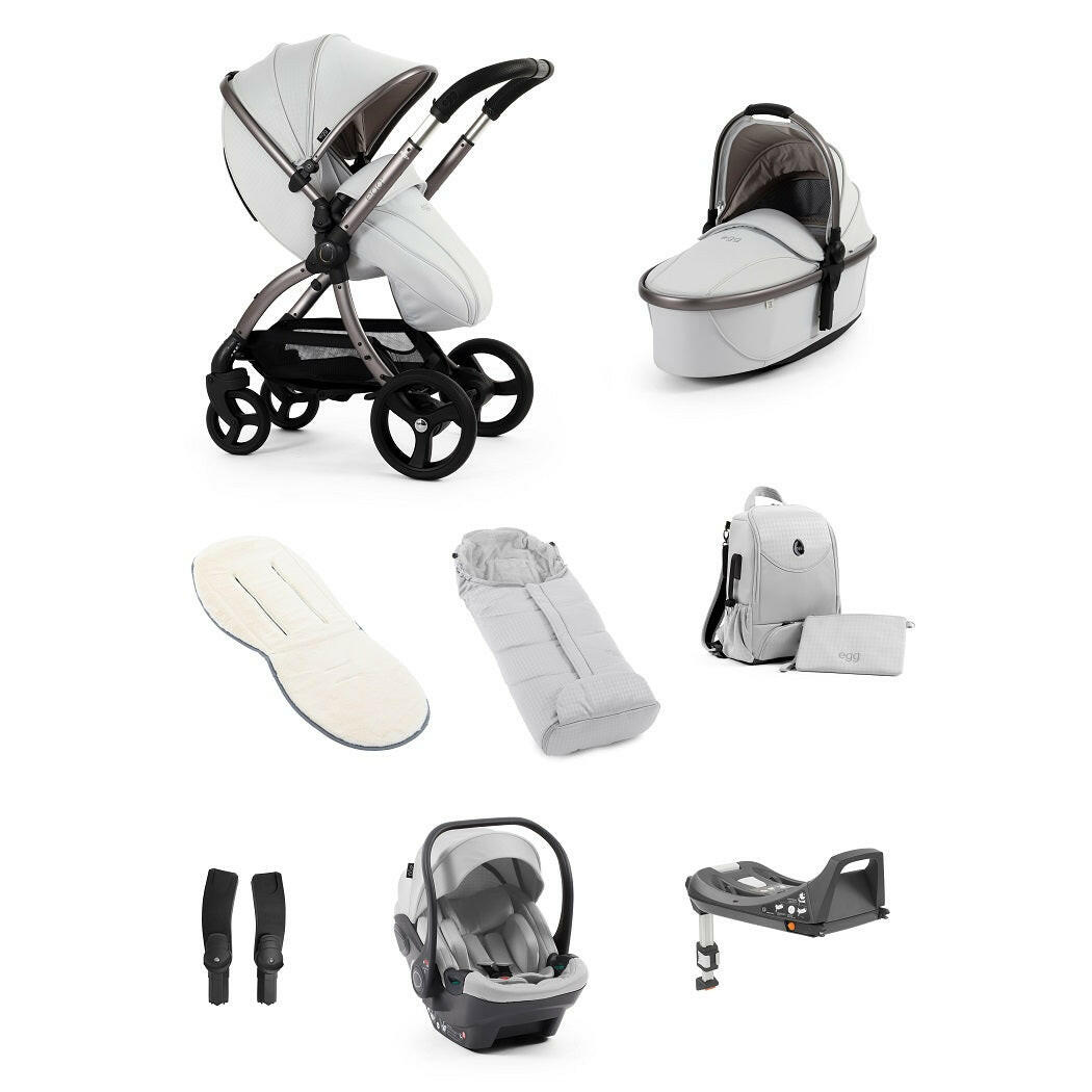 egg3® Luxury Bundle (Houndstooth Silver - Special Edition) comprises of a carrycot, reversible seat unit, chassis and accessories with a matching egg3 Shell i-size car seat and ISOFIX base.