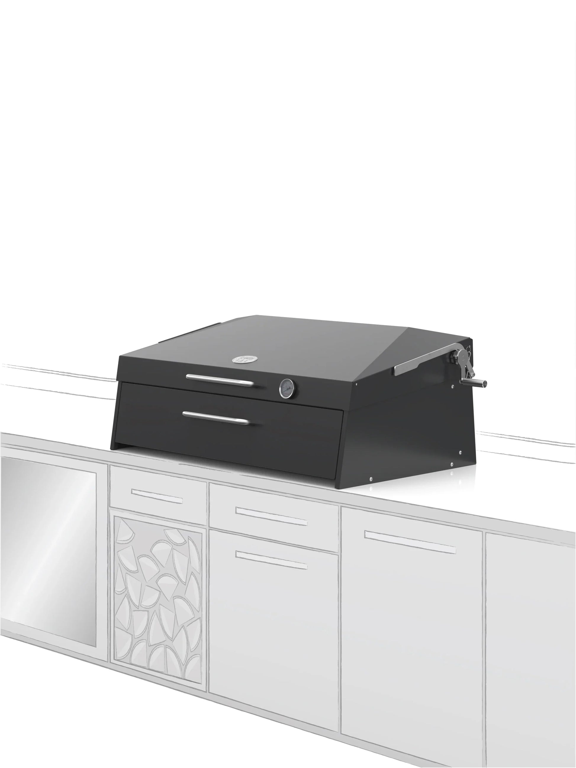 Whilst the Flamery Grills are primarily designed as grills first and foremost, there are added benefits to the lined and insulated lid and drawer. With the lid closed your Flamery grill retains a great deal of heat, allowing the internal temperature to increase, facilitating cooking in a number of different ways such as baking pizzas and breads. With the door open air is pulled through the front aperture and exhausts through the back of the lid.