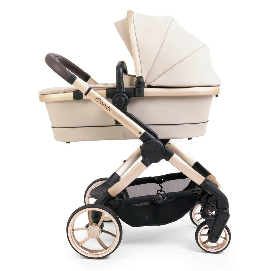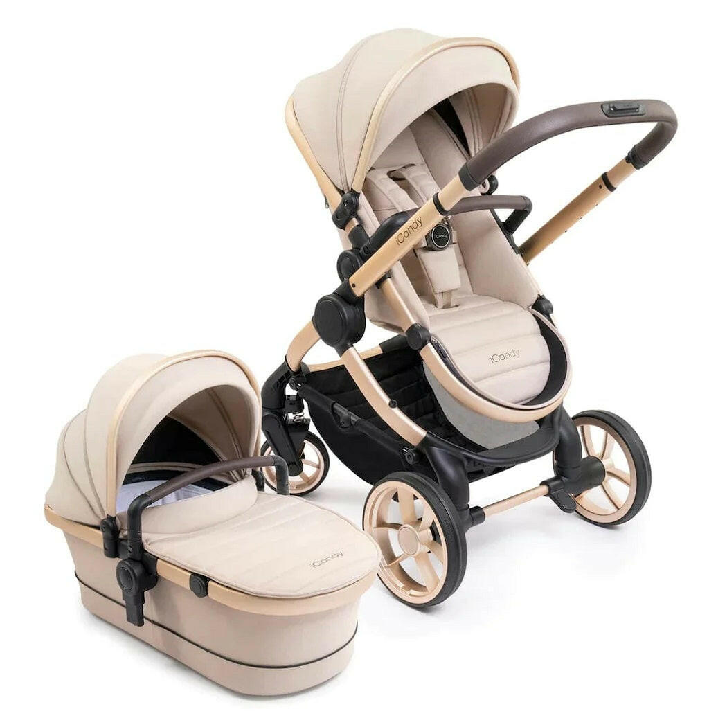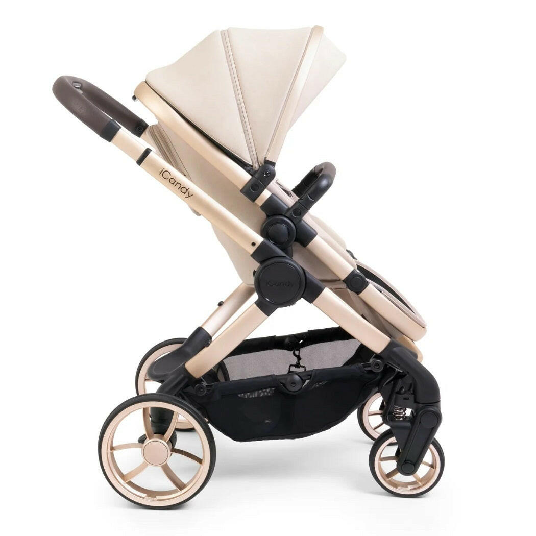 Peach 7 Editions Pram Pushchair Complete Bundle (Biscotti) by iCandy is a luxury pushchair and matching carrycot on a blonde chassis with matching accessories.