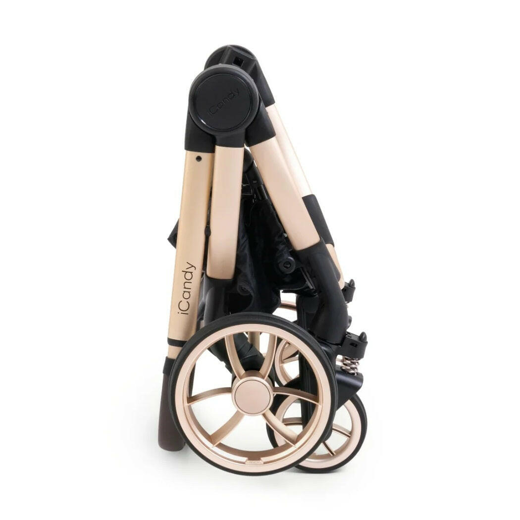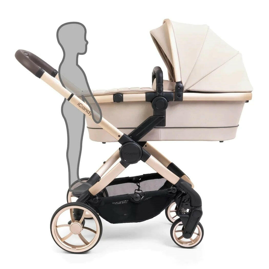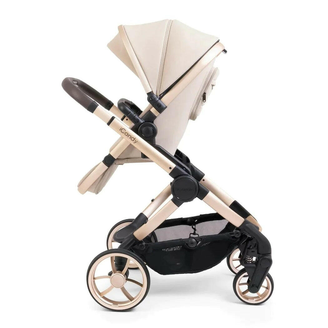 Peach 7 Editions Pram Pushchair Complete Bundle (Biscotti) by iCandy is a luxury pushchair and matching carrycot on a blonde chassis with matching accessories.